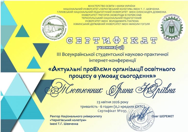Сковородинівка Ірина Тютюнник взяла участь у ІІІ Всеукраїнській студентській науково-практичній інтернет-конференції на базі НУ «Чернігівський колегіум» імені Т. Г. Шевченка